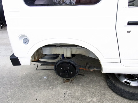 ① 車載工具を使って ジャッキで車体を上げて、リアタイヤを外しました