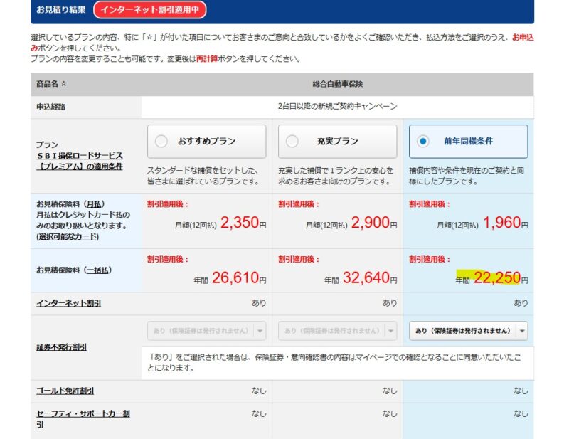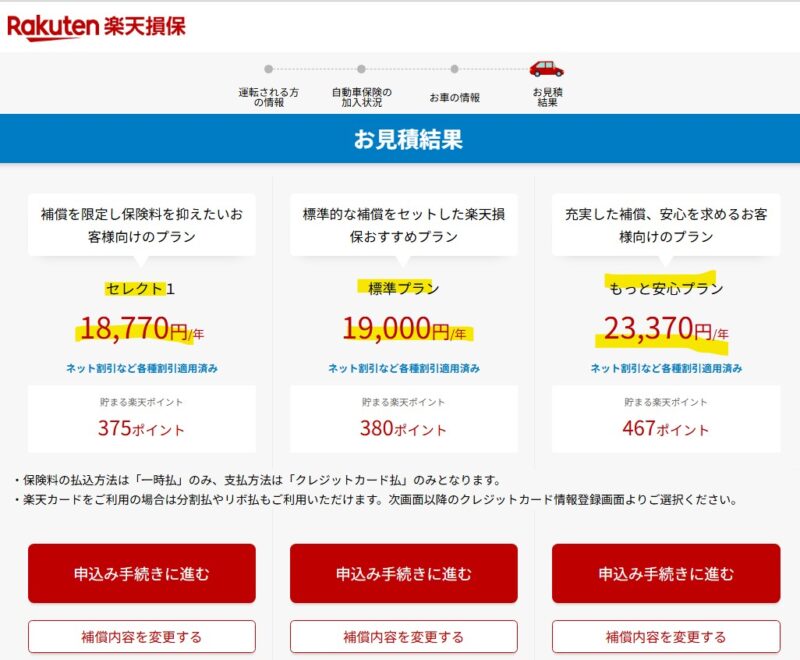 SBI損保だと 4年目 前回同様の条件にすると 22,250円と 少し安くなる。 今回は昨年気になっていた楽天損保を調べてみると・・ 18,770円 と安い。 一日寝かして考えてみて・・ デメリットを調べると、どちらも事故対応力の満足度が低そう・・ その他細かい条件は 少しずつ違うけど調べだすときりがない。 年間走行距離が少ないし、最低限保険としての機能はあるので 今回楽天で契約してみました。