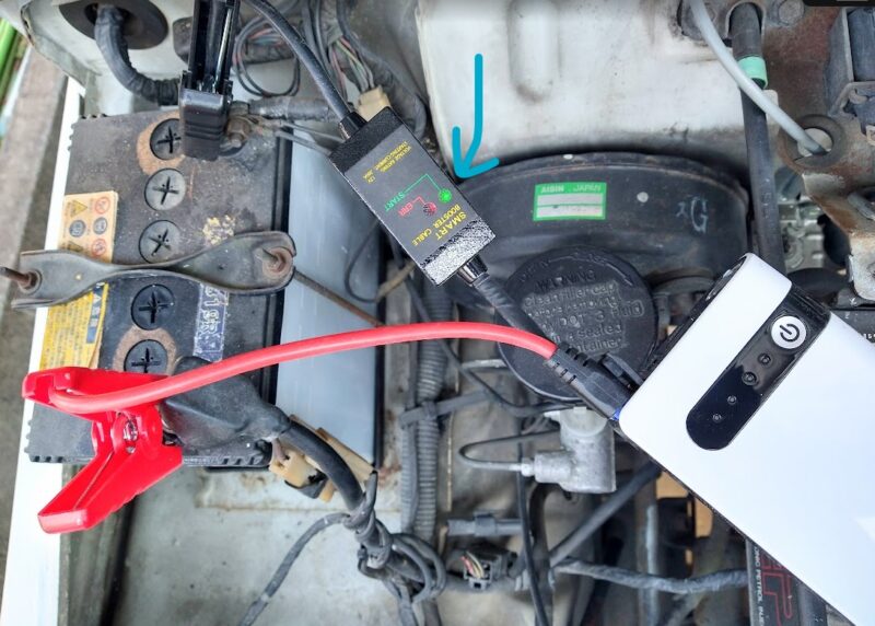 ⑦エンジンが掛かったら モバイルバッテリーからジャンプスターターケーブルを抜き