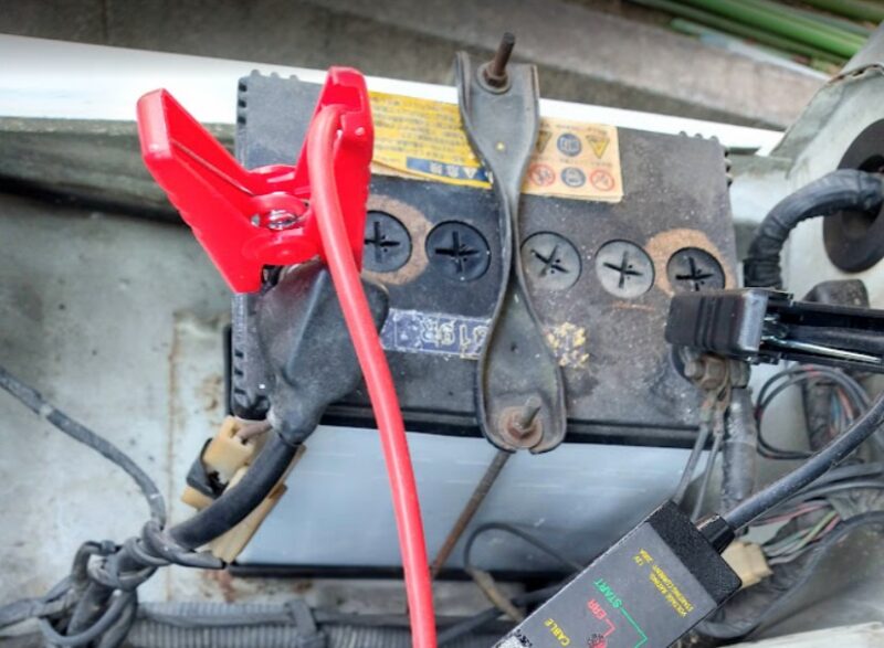 ⑤そのまま、つないだまま1分くらい待って改めてセルを回すと「ギュルっ」という音で セルモーターが動きました まだ エンジンはかからず もう少しって感じです